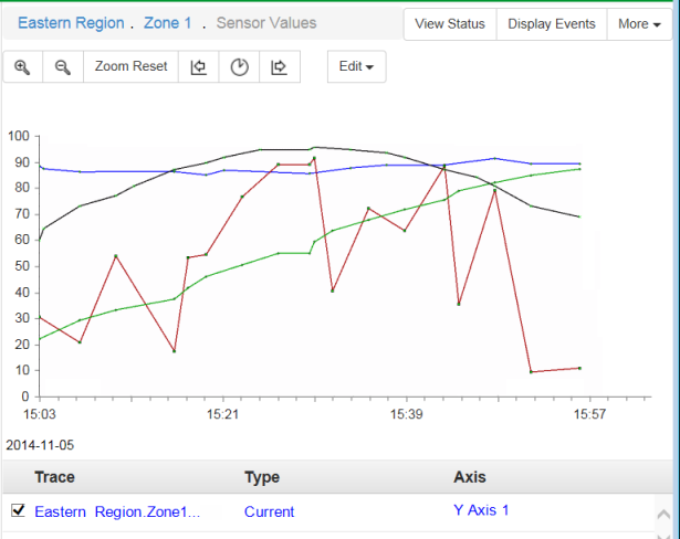 - Zoom In—Use this option to decrease the amount of time shown on the x-axis, so that you can view the differences in trace values more closely. The option is equivalent to the Zoom In option that is available for Trends on ViewX clients. For more information, see Zooming In and Out on a Trend.