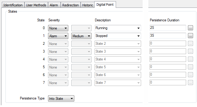 (If the Persistence Type was ‘Out of State’, when the point changed from ‘Running’ to ‘Stopped’, only two seconds would need to have elapsed before the value and state were recorded as having changed (as the Persistence Duration for the state that was being left is specified as 2S (2 seconds)). Again, if the point value changed back at any time during the two-second persistence period, the fleeting change in value and state would not be recorded, as the point would be deemed not to have changed value.)