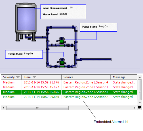 Mimics can contain embedded Alarms Lists and/or hyperlinks to Alarms Lists.