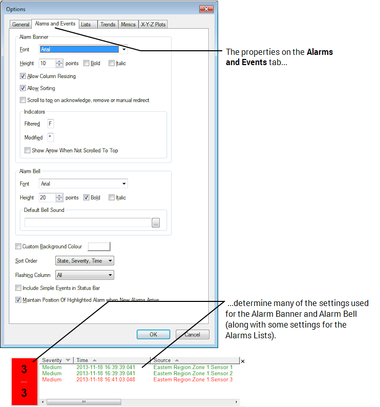 ClearSCADA has predefined default settings that affect the appearance and behavior of the Alarm Banner and Alarms Lists on ViewX clients. For example, there are default settings for the type of fonts used, the sort order, and the default alarm bell sound. By using the Options window, you can adjust these settings to suit your own requirements.