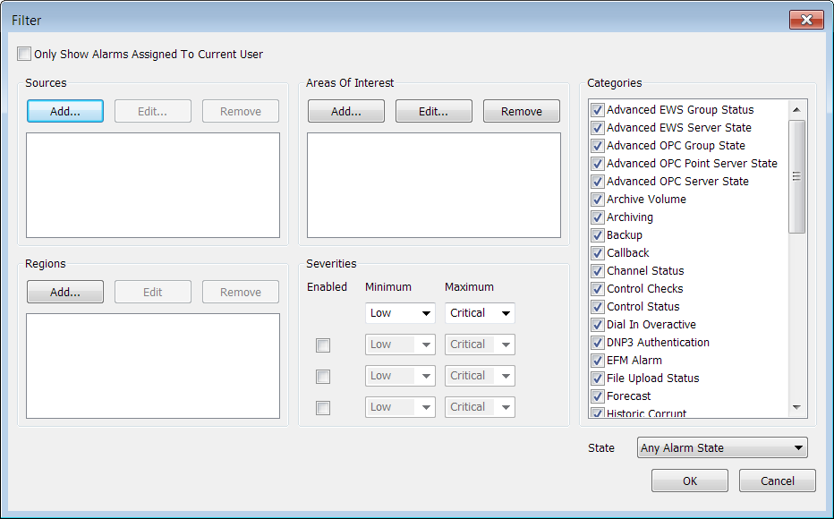 - Use the Categories section to define which categories of alarm are shown see Filter Alarms by Alarm Category. The categories vary, depending on the drivers that are installed on your system.