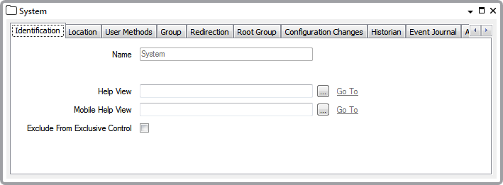 IdentificationUse the Identification tab to optionally Specify a Help View and whether to exclude the whole system from exclusive control (see Specify Whether to Exclude a Group or Database Item from Exclusive Control).