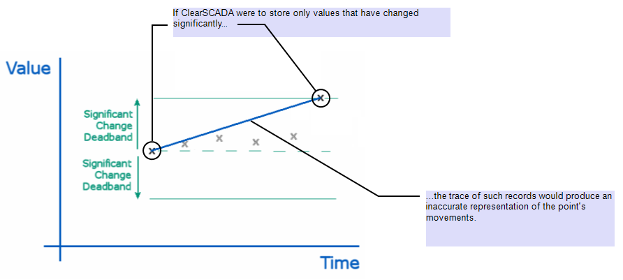 (If ClearSCADA were to only store significant changes in point value historically, whenever such values were, for example, displayed as a historic Trend, the interpolation in the trend between the stored values might not accurately reflect the known values of the point, and therefore might be misleading.)