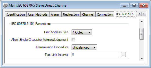 When a Slave Channel is configured to use an IEC 60870-5-101Protocol Type (see Specify the IEC 60870-5 Communications Protocol), you need to configure these properties on the IEC 60870-5 tab: