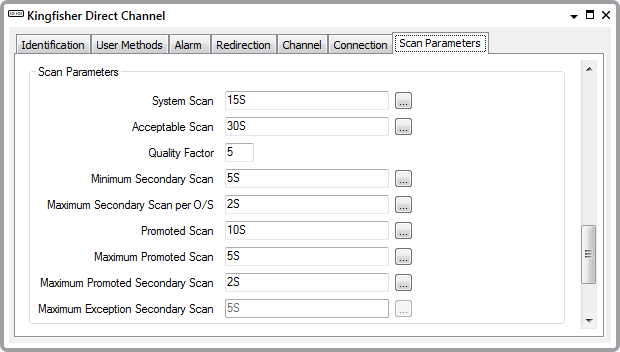 Use the second Scan Parameters section on a Kingfisher Direct Channel Form’s Scan Parameters tab to define the permitted scan durations for the direct channel.