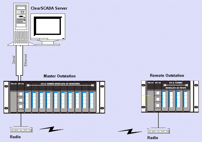 In the diagram below, ClearSCADA is retrieving its information from a Kingfisher Master Outstation that is using the primary communications Line A ‘Ethernet’.