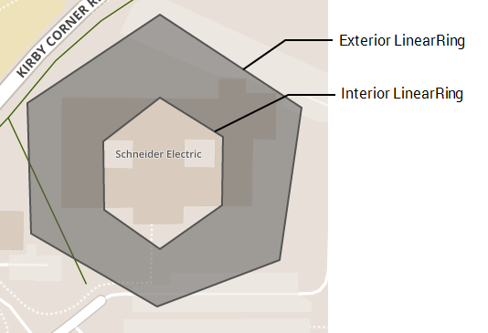 Polygons are not just enclosed areas, but can have cut-outs or holes. To understand how to construct polygons with cut-outs we need to introduce a new term: the LinearRing. LinearRings are a set of positions that define a line that encloses a space (a polygon), however, you can have an exterior LinearRing and none, one or more interior LinearRing. For Polygons with multiple rings: