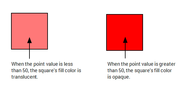 When the point's CurrentValue is less than 50 the FillColour of the square will have a transparency of 135 so it will be visible, but translucent. When the point's CurrentValue is not less than 50, the FillColour of the square will be 255 (opaque).