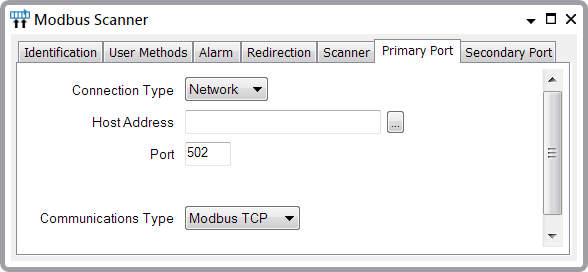 Use the fields on the Primary Port and Secondary Port tabs to specify how many ports are available to a scanner, the port number, communications protocol, and the address of the Modbus device that is to be scanned.