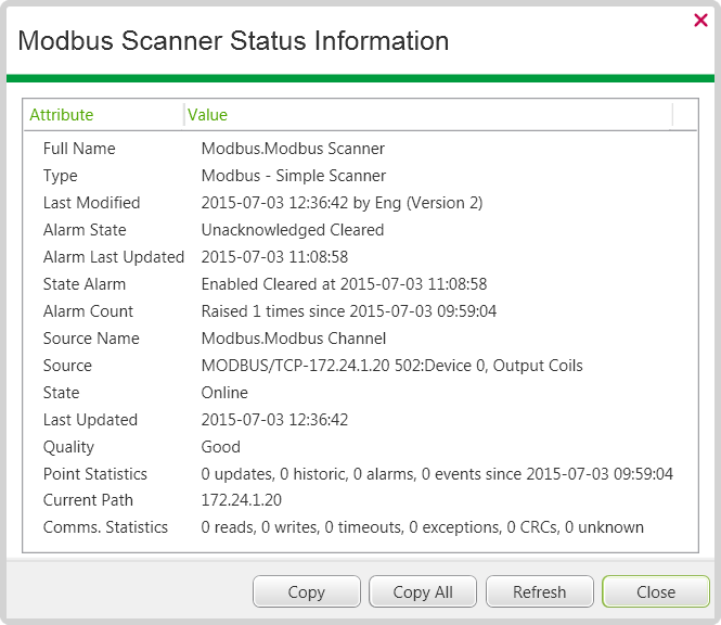 The Status display for each Simple Modbus Scanner provides information about the present state of the individual scanner.