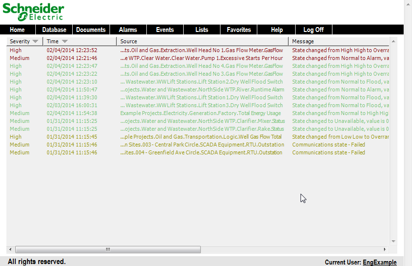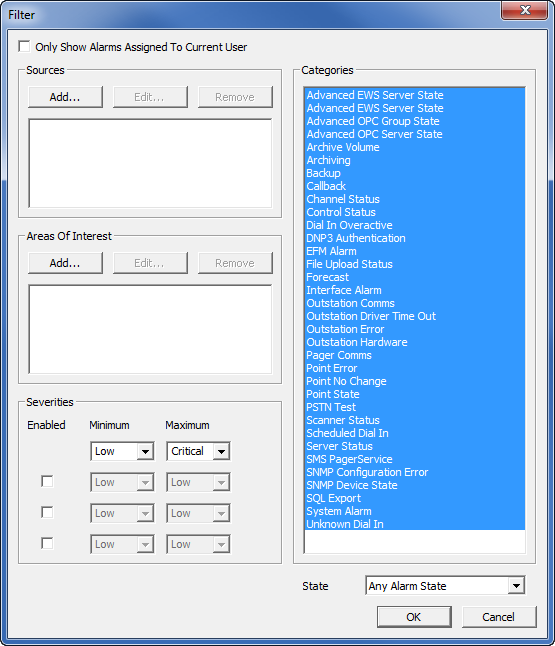 - Select the OK button to confirm and close the Add Source window. You will see that the Sources list now contains 'SiteABC.*' which means the Alarms List is filtered to only show alarms for items that are in the 'SiteABC' Group or its subgroups.