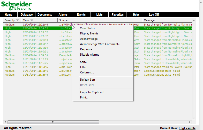 - Right-click on the background of the Alarms List to display a context sensitive menu.