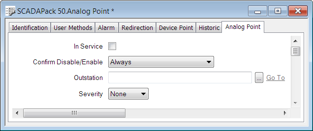 - In Service—Specify whether the point is active or inactive (see Placing an Item In Service in the ClearSCADA Guide to Core Configuration).