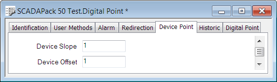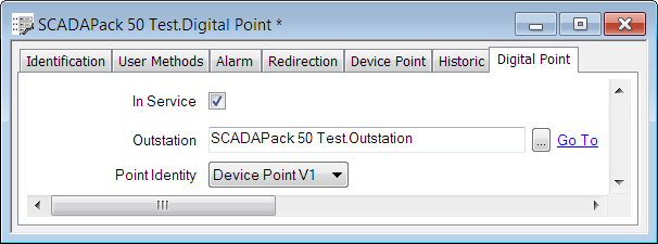 - Save the property settings (see Saving Configuration Changes in the ClearSCADA Guide to Core Configuration) and close the SCADAPack 50 Test.Digital Point window.