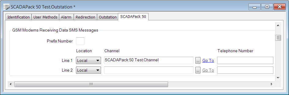 - Line 1 Channel—Use the browse button to display a Channel Reference browse window. Select the SCADAPack 50.Test Channel entry from the window.