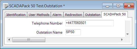 - Save the property settings (see Saving Configuration Changes in the ClearSCADA Guide to Core Configuration) and close the SCADAPack 50 Test.Outstation window.