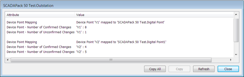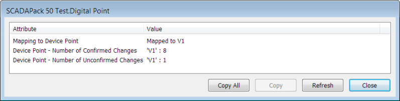 For points, this status attribute shows the device point (V1-V8) to which a ClearSCADA point maps, as shown in the illustration below: