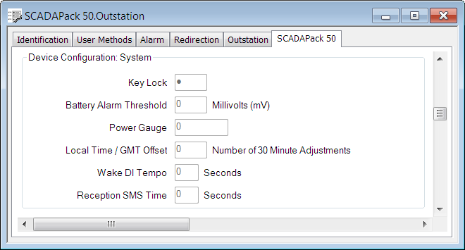 Use the fields within the Device Configuration: System section on the SCADAPack 50 tab to set various system properties for the device.