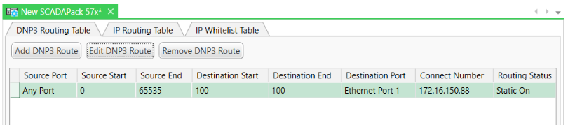 - Static On—The route is enabled. If the route uses TCP/IP, the SCADAPack x70 device will update the Connect Number whenever it receives DNP3 frames that match the route table entry. If a return route for the frame does not already exist in the DNP3 Routing Table, the SCADAPack x70 device will create a dynamic return route.