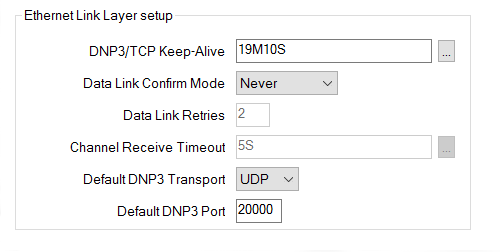 Use the fields in the Ethernet Link Layer setup section of the DNP3 Settings tab to specify the default DNP3 over IP properties for the SCADAPack x70 device.