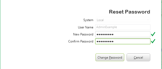 - Enter the new password for the user account in the New Password field. When the password matches either the default security criteria or individual user security settings a green tick appears.