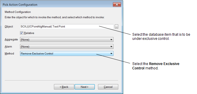 If you are using a method pick action on a Mimic, you can use the Pick Action Wizard to associate a Mimic object with the Remove Exclusive Control method of a database item.