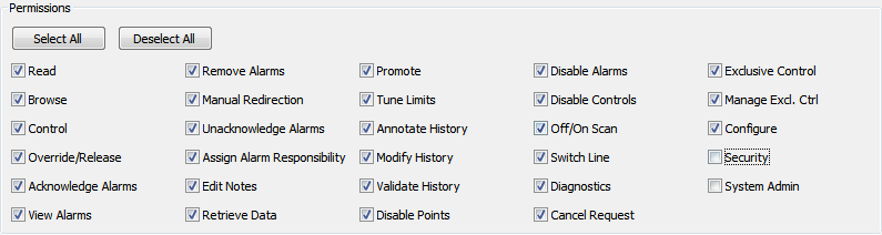 The availability of the permissions shown is dependent on the Permission Restrictions settings (see Define whether any Permissions are Restricted). By default, the Unacknowledge Alarms and Assign Alarm Responsibility permissions are restricted and so are not available.