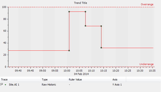 If you look at the y-axis, you will see that it is automatically configured to represent the entire range of values that have been configured for the 'AI 1' point (0 to 100). This is because the y-axis uses the default Mode of Range, which means it represents the configured range for the point.