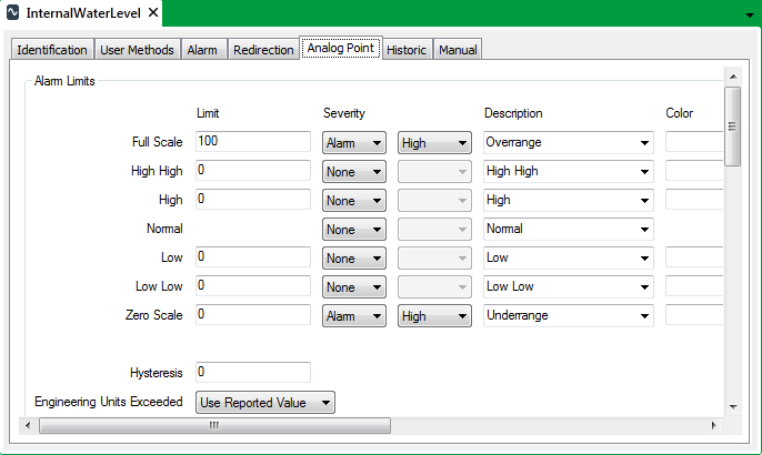 In the Alarm Limits section, you will see a Limit column of fields, with a field for each limit (Full Scale, High High, High, Low, Low Low, and Zero Scale). You will use these fields to define the thresholds. To the right of each field are Severity, Description, and color settings for each limit. You can use these settings to define what happens when the point’s value is within the threshold for the limit, how significant values in the threshold limit are, and to provide a description of the limit and associate it with a color.
