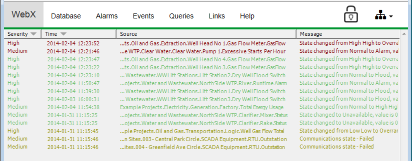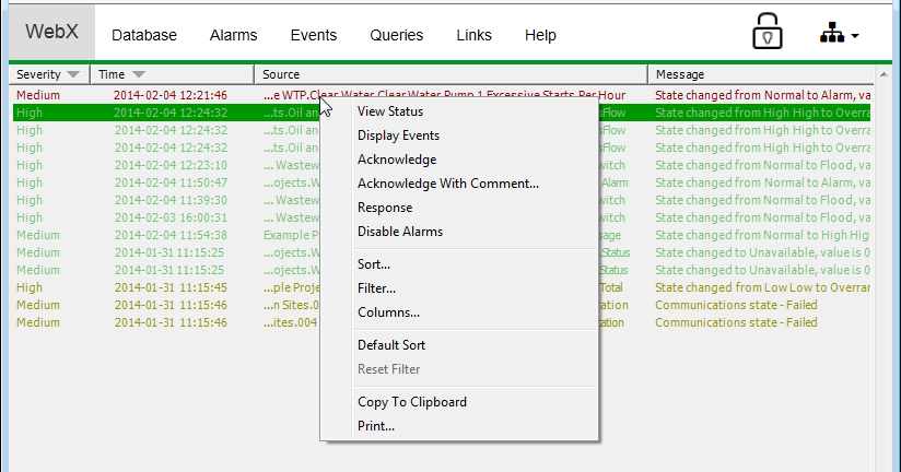 You can see that on the context-sensitive menu for the alarm, you have access to the alarm response options such as Acknowledge and Acknowledge with Comment. These alarm response features work the same way as on a ViewX client, enabling operators and engineers can manage alarms remotely.