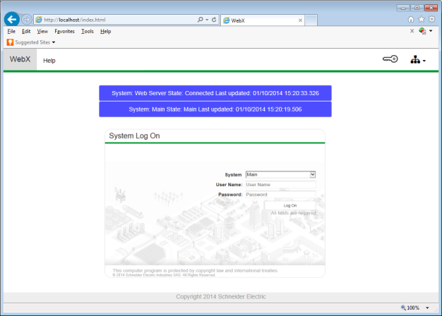 The Log On window is also displayed. To access the ClearSCADA database, you need to log on to WebX using a valid user account. As with ViewX, access to your database via the web is dependent on the permissions that are allocated to your user account.