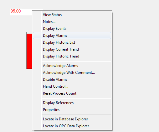 - Examine the animated objects on the 'MyTestPlant' Mimic. You will see that they have changed to indicate that the point is in alarm. The formatted value in the animated text box changes color to red and flashes so that it attracts your attention. The bar in the animated size box increases in size to indicate that the value is close to the maximum value of the point (Full Scale) and also changes color to indicate an alarm.