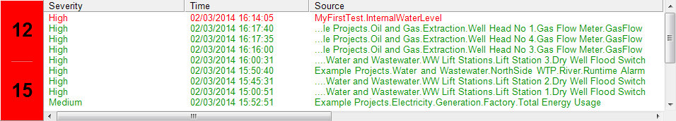 You will see that the alarm you have triggered for the 'InternalWaterLevel' point is included in the list of alarms. It is placed at the top of the list and is shown in flashing red text. This is because the alarm you have triggered has the highest priority, as it is: