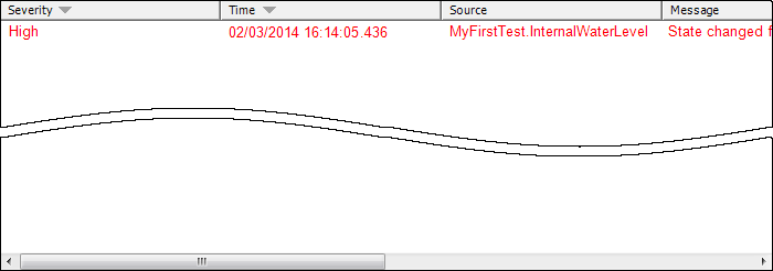 You will see that the alarm you have triggered for the 'InternalWaterLevel' point is included in the list of alarms. It is placed at the top of the list and is shown in flashing red text. This is because the alarm you have triggered has the highest priority, as it is: