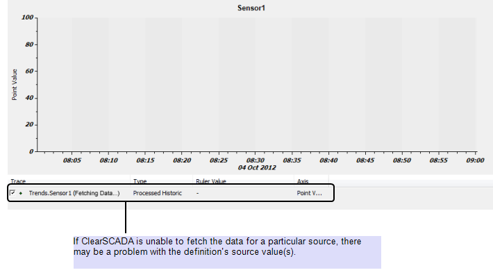 The message (Fetching Data...) continues to be displayed when a particular ad hoc Trend is viewed. The source item itself has no errors and ClearSCADA is in communications with the device on which the source is located.