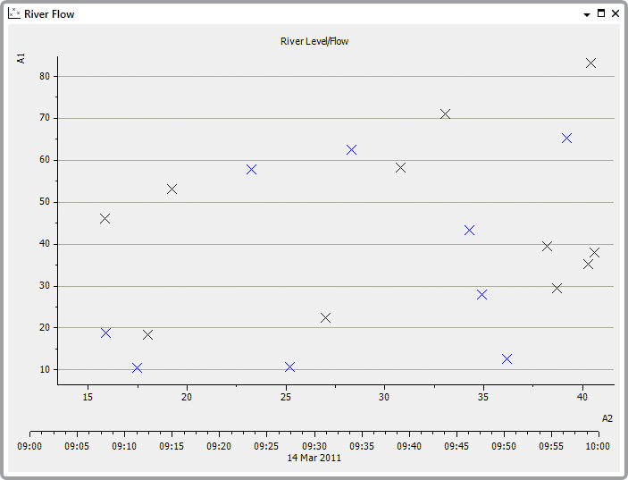 In this section, we are going to explain how to access an X-Y Plot in Run mode. When you have displayed an X-Y Plot in Run mode, you can use it to examine the relationship between the values provided by the two data sources.