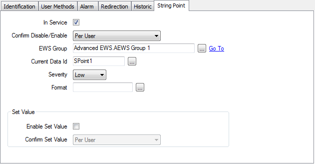 - Select the Enable Set Value check box, (Ensure that the check box is clear if the string is an input point).
