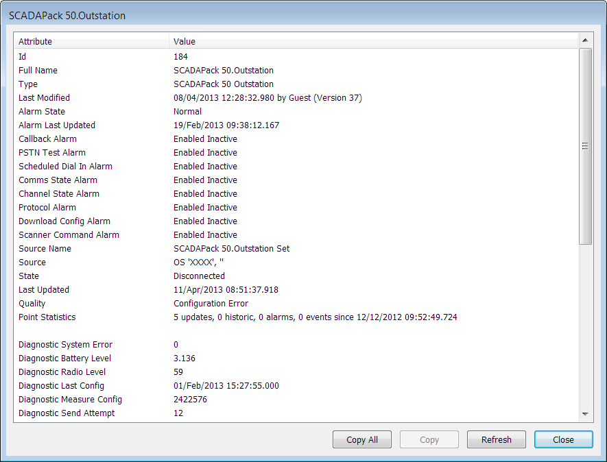 Every item in the ClearSCADA database has its own Status display (also referred to as a View window or View dialog). You view an item's Status display by selecting that item's View Status pick action or menu option. The Status display provides information about the status of the selected item, presenting the information in the form of 'status attributes'. For further information about working with Status displays, see Status Displays.