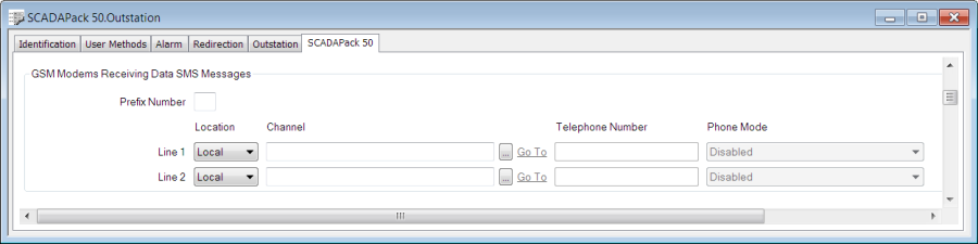 - Location Line n—Specify the destination to which the device should send SMS messages. This will be a local ClearSCADA channel and/or a remote telephone number. You can specify up to two destinations (Line 1 and Line 2). However, only one destination should be to a local ClearSCADA channel, to avoid duplication of SMS messages in ClearSCADA.