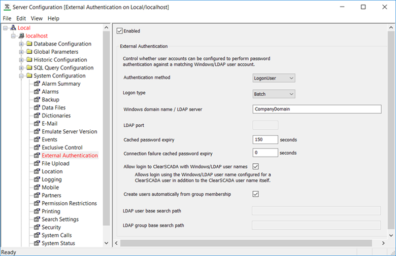 An administrator sets up the External Authentication requirements on the server, using the ClearSCADA Server Configuration tool. The settings specify that the company will be using the LogonUser method to authenticate logon credentials against user accounts in the Windows domain 'CompanyDomain'. Also that the user accounts only require Batch logon access to the ClearSCADA server (this is the more secure Logon Type option, which only requires users to have minimal access rights on the server in order to use the External Authentication feature in ClearSCADA). The check box for 'Allow login to ClearSCADA with Windows/LDAP user names' is selected, to enable users to use their more familiar Windows domain user names for logging in to ClearSCADA. The Create users automatically from group membership check box is also selected, to enable ClearSCADA to create User accounts automatically at logon if required.