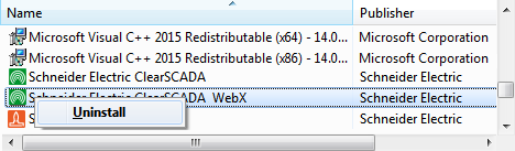 The options in the menu at the top of the list change and now show an Uninstall option.Alternatively, you can right-click on Schneider Electric ClearSCADA to display a context-sensitive menu.