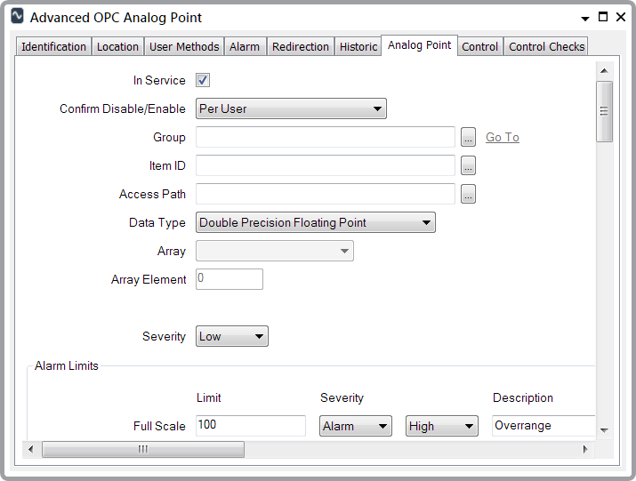 This section covers configuration of the analog-specific properties on the Analog Point tab of the Form.