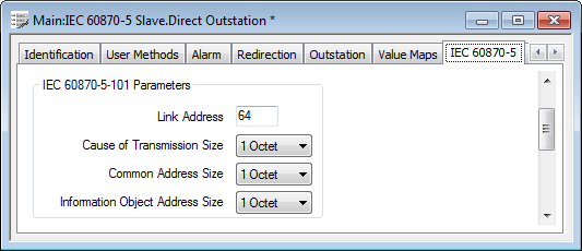 The fields within the IEC 60870-5-101 Parameters section of the IEC 60870-5 tab apply to IEC 60870-5 Slave Direct Outstations that communicate with ClearSCADA using the IEC 60870-5-101 protocol. (To communicate with ClearSCADA using the IEC 60870-5-101 protocol, the channel through which the outstation communicates has to be configured to use the IEC 60870-5-101 Protocol Type (see Specify the IEC 60870-5 Communications Protocol).)