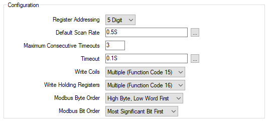 The Configuration section of the Modbus tab allows you to specify the settings that enable the SCADAPack x70 to scan the Modbus Slave device.