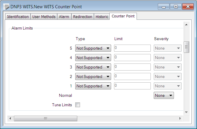 WITS counter-type points can have up to five alarm limits that you can configure to suit your requirements. The Device Profile defines how many alarm limits a Field Device supports (see Display a WITS Device Profile).