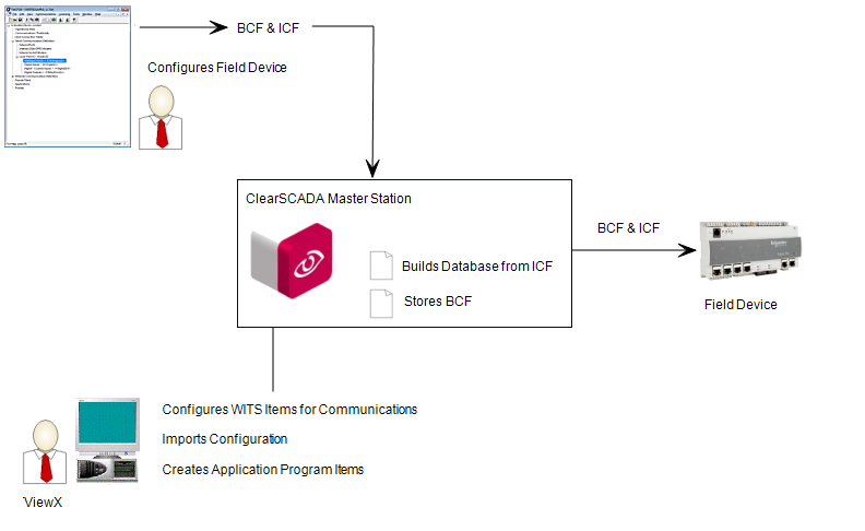 If your WITS Field Device supports configuration download, it is possible to configure the Field Device settings using the device's Configuration Application. These settings can then be imported into ClearSCADA and downloaded to the Field Device. In this scenario, there is no need for the Configuration Application to connect directly to the Field Device. So once an engineer has visited the Field Device and set it up so that it can communicate, the configuration can be defined remotely (by using the Configuration Application and ClearSCADA).