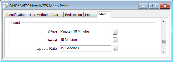 The WITS Mean Point is a type of analog point. Therefore, many of the fields in the Trend section of the Mean tab are the same as those for other WITS analog points. The Maximum, Minimum andLogarithmic field values are inherited from the parent point (see Define an Analog Point's Trend Settings).