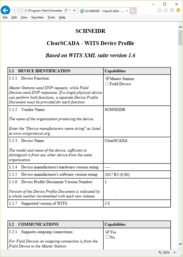 The Device Identification section indicates the name of the Field Device/Master Station to which the profile belongs, in this case, ClearSCADA. It also contains information about the software version and the supported WITS version. (Different vendors use different formats for their software version strings, and these may not be an exact match to your device). Other sections of the device profile, such as the Communications section, indicate the capabilities of ClearSCADA. The device profiles for other Master Stations and Field Devices will provide the same type of information.