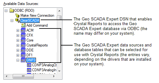 In order to use Geo SCADA Expert data in a report, the Crystal Reports application needs to access the Geo SCADA Expert database. In order to do this, you need to specify an ODBC connection to the database. You need to specify this connection whenever you create a report or subreport.