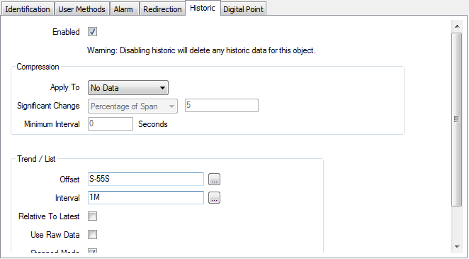 1MThis sets the Interval to 1 minute. So the Historic Trend for the point will show 1 minute on the x-axis, with the first time on the x-axis being 55 seconds in the past.